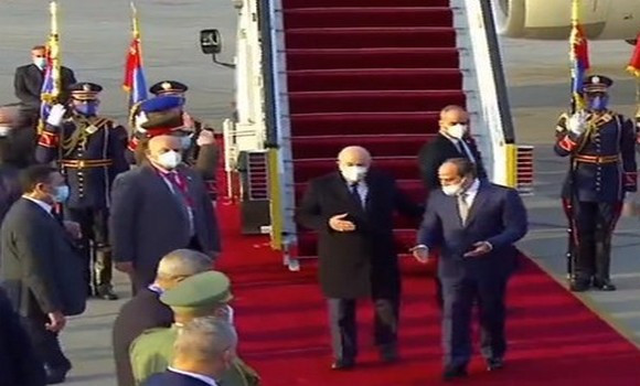 Le Président Tebboune a été accueilli, à l’aéroport international du Caire, par le président égyptien, Abdel Fattah al-Sissi et de hauts responsable égyptiens.