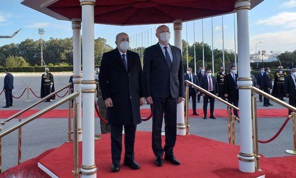 Les Présidents Abdelmadjid Tebboune et Kaïs Saïed ont écouté les hymnes nationaux des deux pays avant de passer en revue un détachement militaire qui leur a rendu les honneurs, au moment où les 21 coups de canon retentissaient en l’honneur de l’invité de marque de la Tunisie.